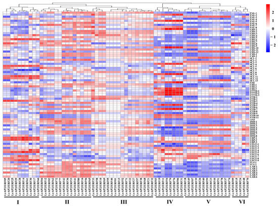According to the findings of the co-expression study, the relationship between the LrAP2/ERF genes and the anthocyanin biosynthesis genes in Lycoris may be clustered into six primary clusters (Figure 9 and Table S3). Multiple LrAP2/ERFs genes in cluster II (LrAP2/ERF16, LrAP2/ERF36, LrAP2/ERF41, LrAP2/ERF42, LrAP2/ERF53, LrAP2/ERF56, LrAP2/ERF65, and LrAP2/ERF80) displayed positive correlations with structural genes in the anthocyanin pathway. Conversely, LrAP2/ERFs in cluster V (LrAP2/ERF07, LrAP2/ERF18, LrAP2/ERF39, and LrAP2/ERF49) demonstrated an inverse link to anthocyanin biosynthesis pathway genes in Lycoris. Some LrAP2/ERFs genes in cluster IV (LrAP2/ERF16, LrAP2/ERF36, LrAP2/ERF41, LrAP2/ERF42, LrAP2/ERF53, LrAP2/ERF56, LrAP2/ERF65, and LrAP2/ERF80) had a considerable positive correlation with PAL-2, PAL-4, CHS-10, 4CL-4, 4CL-10, F3′5′H-1, F3′5′H-2, F3′5′H-3, F3′H-5, and F3′H-7 genes in the anthocyanin pathway. Cluster II LrAP2/ERFs were co-expressed with genes involved in the anthocyanin pathway, and LrAP2/ERF02, LrAP2/ERF04, LrAP2/ERF16, LrAP2/ERF36, and LrAP2/ERF42 were chosen for their ability to regulate the accumulation of anthocyanins. It was observed that the identified anthocyanin biosynthesis genes and key transcription factors were remarkably linked to seven anthocyanins: cyanidin-3-O-sambubioside, peonidin-3-O-(6″-O-caffeoyl)glucoside, cyanidin-3-O-sophoroside-5-O-glucoside, cyanidin-3-O-(6″-O-p-hydroxybenzoyl) sophoroside-5-O-glucoside, cyanidin-3-O-(6″-O-acetyl-2″-O-xylosyl)glucoside, cyanidin-3-O-(6″-O-caffeoyl) glucoside, and pelargonidin-3-O-glucoside-5-O-arabinoside (Figure 10, Tables S2 and S3). The aggregation of nine anthocyanins and anthocyanin enzyme-encoding genes was favorably correlated with the expression of several key LrAP2/ERFs (LrAP2/ERF02, LrAP2/ERF10, LrAP2/ERF16, and LrAP2/ERF36), suggesting that they might be involved in anthocyanin accumulation and contribute to the red color of L. radiata petals.