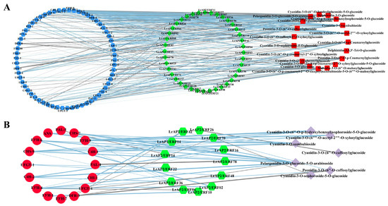 The regulatory network of key anthocyanin biosynthesis genes, metabolites and LrAP2/ERF genes in Lycoris. (A) Correlation network of LrAP2/ERF genes and anthocyanin biosynthesis genes involved in anthocyanin biosynthetic pathways. r represents the Pearson correlation coefficient; relation represents the correlation, including positive (r > 0.8) and negative correlations (r < −0.8). (B) Correlation network of metabolite-related LrAP2/ERF genes and anthocyanin biosynthesis DEGs involved in anthocyanin biosynthetic pathways. r represents the Pearson correlation coefficient; relation represents the correlation, including positive (r > 0.9) and negative correlations (r < −0.9).