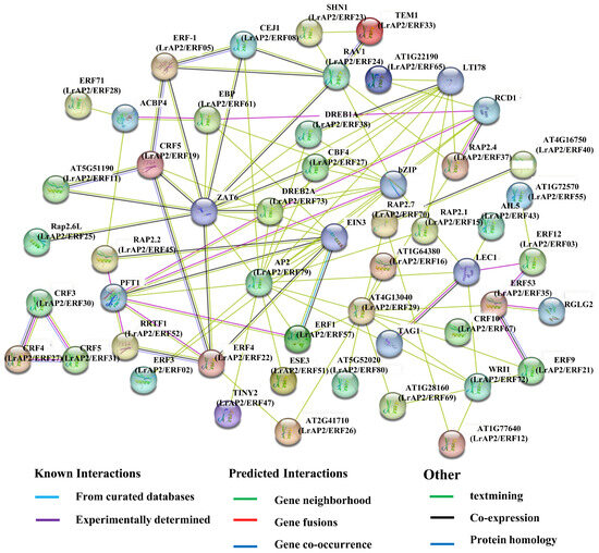 Potential protein–protein interaction networks were predicted using the STRING.410 online database based on A. thaliana homologous proteins [87] (https://string-db.org, accessed on 27 June 2022). A. thaliana was used as the comparative organism, while the protein sequences of LrAP2/ERFs were uploaded to the server. After the execution of blasting with the highest bitscore, the LrAP2/ERFs gene interaction network was developed.