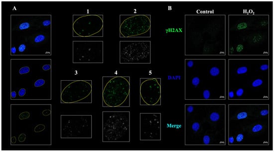 In DNA damage and repair, nuclear foci serve as areas where proteins involved in repair concentrate during DNA damage, with and specific foci such as γH2AX. Sites of double-strand breaks (DSBs) are labeled with γH2AX, which is a representative biomarker of DNA DSB [14,15]. γH2AX is a form of the histone H2A variable (H2AX) protein. Phosphoinositide 3-kinase-like kinase (PIKK) family proteins, such as ataxia telangiectasia mutated (ATM), ataxia telangiectasia, and rad3-related (ATR) phosphorylate, recognize the S139 sequence of the H2AX protein [15,16].