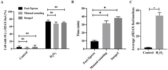 To quantitatively measure the accuracy of the γH2AX foci, over 100 cells were captured and compared using manual counting and ImageJ 1.53 software (Figure 3A,B). Using the Foci-Xpress, manual counting, and ImageJ methods, the ‘Control’ condition showed percentages of 4.5%, 2.65%, and 5.4%, respectively. For the ‘H2O2’ condition, the percentages were 73.5%, 69.4%, and 70.3%, respectively. Furthermore, there was no significant difference in the γH2AX foci performance among the methods (Figure 3A). We utilized Foci-Xpress to represent the average number of foci per entire nucleus. This approach serves as a widely accepted standard in radiation biology experiments and demonstrates our ability to detect damaged cells following H2O2 treatment (Figure 3C). Both sets of data revealed an increase in γH2AX foci due to treatment with the DNA-damaging agent H2O2 (Figure 3A,C). The Foci-Xpress method exhibited a processing speed approximately three times faster than that of the other methods for measuring foci (Figure 3B). Collectively, these results suggest that Foci-Xpress had a foci counting performance similar to that of the other methods, and the time required for counting was short.