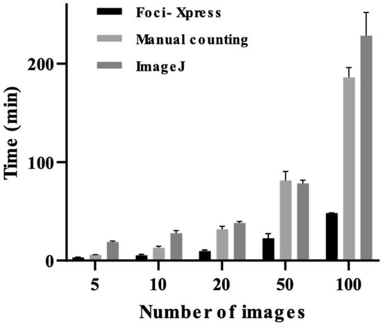 Analysis of the time required for Foci-Xpress. A minimum of 10 images per group were randomly captured using a 40× objective lens following IF staining. The samples were imaged using a confocal microscope (LSM 800, Carl Zeiss). The same set of images was analyzed using three independent methods for each group: 5, 10, 20, 50, and 100 images.