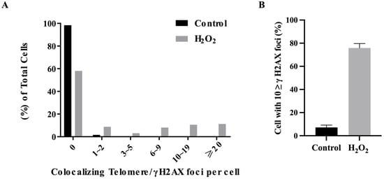 Graphs of colocalized foci and foci counting analysis at a single wavelength using Foci-Xpress. (A) Percentage of colocalization between γH2AX and the telomeric probe in the cells captured in Figure 5. The grey bars represent the H2O2 group, whereas the black bars represent the untreated control group. H2O2: cells treated with 50 µM of H2O2 for 24 h. (B) Percentage of γH2AX in the cells captured in Figure 5. The grey bars represent the H2O2 group, whereas the black bars represent the untreated control group. H2O2: cells treated with 50 µM of H2O2 for 24 h.