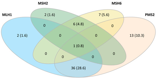 Although the expression of the four markers (MLH1, PMS2, MSH6, and MSH2) is a reliable method, the use of only two markers (PMS2 and MSH6) has been proposed as a more cost-effective alternative for MMR testing [3,29,30]. MMR proteins act as heterodimers (MLH1-PMS2 and MSH2-MSH6). PMS2 and MSH6 are only stable within the complexes, and their expression is lost when those are not present. PMS2 loss can, therefore, potentially identify all cases with PMS2 loss alone and with MLH1-PMS2 dual loss, while MSH6 loss would detect cases with isolated MSH6 loss and combined MSH2-MSH6 loss. The main disadvantages of this simplified method are that (1) a second IHC round with MLH1 and MSH2 should be performed for dMMR cases if the specific gene needs to be identified, and (2) cases with isolated loss of MLH1 and MSH2 are potentially missed. These cases represent 0–3% of the published series and of a recent meta-analysis [31]. The two-marker approach misidentified four cases (3%) in our series. Although two-marker IHC testing might be acceptable for the initial screening of dMMR, considering that MMR status can identify the best candidates for immunotherapy, more studies are needed to establish solid conclusions.