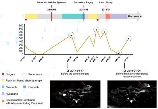 All of the blood and tumor samples were collected from a 61-year-old Chinese woman with high-grade serous ovarian cancer (HGSOC). DNA extracted from peripheral white blood cells was used for the germline mutation analysis. Tumor samples were derived from primary and secondary surgeries and a biopsy from a metastatic liver. Such tissue samples were fixed in 10% neutral formalin for 24 h to generate FFPE block.