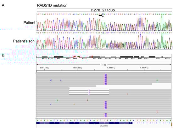 Next-generation sequencing (NGS) was conducted for the RAD51D genes in a 781 Chinese ovarian cancer patient cohort by the Chinese Academy of Medical Sciences and Peking Union Medical College, Beijing. The results showed that RAD51D germline pathogenic mutations were detected in 1.7% (13/781) of patients and the RAD51D c. 270_271dup (p. Lys91fs) mutation was the most common mutation, found in seven patients (7/13, 53.1%) [