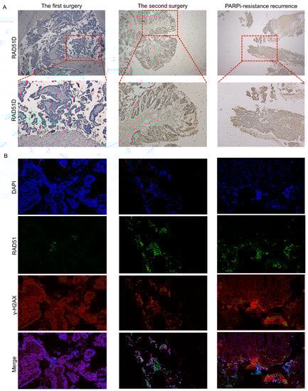 Serial 4 µm sections were incubated with primary antibodies (RAD51D, ab202063, 1:250, Abcam, Cambridge, MA, USA) overnight at 4 °C. Sections without primary antibody incubation were used as negative controls. Goat anti-mouse horseradish peroxidase–conjugated secondary antibody was used. The chromogenic reaction was performed with DAB.