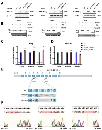 Different plasmids were constructed to overexpress wildtype and mutant RAD51D. The amplified RAD51D coding sequences with wildtype or with the primary (LRG_516t1: c.270_271dup) or secondary (LRG_516t1: c.271_282del) mutation were inserted into the pGMLV lentiviral vectors (Genomeditech Co., Ltd., Shanghai, China).