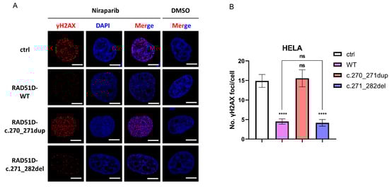 HELA cells were treated with dimethyl sulfoxide (DMSO) or DMSO with 10 μmol/L niraparib (Selleck, Houston, TX, USA) for 24 h. The cells were fixed with 4% paraformaldehyde, permeabilized with PBT (0.25% TritonX-100 in PBS), blocked with blocking buffer (5% BSA in PBT), and incubated with rabbit anti-γH2AX (1:200, 9718, Cell Signaling Technology, Danvers, MA, USA). Anti-rabbit Cy3 was used as a secondary antibody. Nuclei were counterstained with DAPI (S36973, Thermo Fisher, Waltham, MA, USA). The cells were imaged at 60× using a Confocal Laser Scanning Microscope FV3000 (Olympus GmbH, Hamburg, Germany). At least 50 cells per cell line were counted using FociCounter [