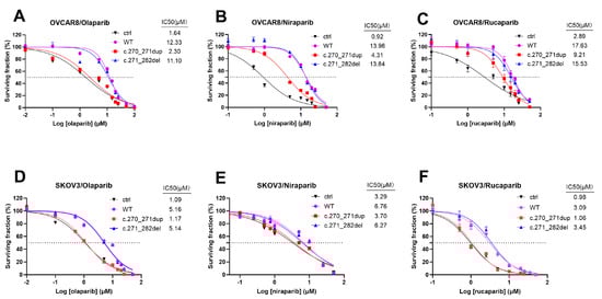 Cell viability was measured using a commercial CCK-8 assay kit (APExBIO, Houston, TX, USA). The cells were plated in 96-well plates at a density of 2000 per well and grown for 24 h. Then, the cells were treated with fresh media containing various concentrations of olaparib, niraparib, and rucaparib (Selleck, Houston, TX, USA) for 72 h. Each well was treated with 10 μL of CCK-8 reagent; then, the cells were incubated at 37 °C for another 4 h before measuring the absorbance at 450 nm using microplate reader (Perkin Elmer, Waltham, MA, USA).