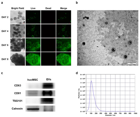 Cultivation of human umbilical cord mesenchymal stem cells (hucMSCs) and identification of human umbilical cord mesenchymal stem cell-derived extracellular vesicles (hucMSC-EVs). (a) Three-dimensional (3D) cultivation of hucMSCs on day 2, day 4, day 6, and day 8, as indicated by live (green) and dead (red) cell staining. Scale bar: 100 μm. (b) Transmission Electron Microscopy (TEM) image displaying the morphology of hucMSC-EVs. Scale bar: 500 nm. (c) Western blotting analysis of hucMSC-EVs biomarkers (CD63, CD81, TSG101, and Calnexin), with EVs representing hucMSC-EVs in the image. (d) Size distributions of hucMSC-EVs determined via Nanoparticle Tracking Analysis (NTA), revealing an average size of 133.5 nm.