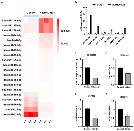 EVs could exert biological functions to regulate many fibrotic diseases, and miRNA is one of the essential components and effectors [29]. We analyzed miRNA expression in hucMSC-EVs via miRNA sequencing with the human embryonic lung fibroblast-derived extracellular vesicles (MRC-5-EVs) as the control group (Figure 2a). The accuracy of the miRNA sequencing results was further verified via qRT-PCR analysis (Figure 2b). Notably, we observed that miR-148a-3p exhibited the highest abundance among the differentially expressed miRNAs in hucMSC-EVs when compared with the control group (|Log2 (Fold Change)| > 2, p < 0.05), strongly indicating a potential association between miR-148a-3p and the functional role of hucMSC-EVs. Additionally, the involvement of various miRNAs in the development and progression of pulmonary fibrosis, as well as silica-induced pulmonary fibrosis, has been extensively reported in the literature [30,31]. In support of our findings, an analysis of a silicosis database (GSE80555) demonstrated that miR-148a-3p was downregulated in silicosis patients (Figure 2c). We observed a similar downregulation of miR-148a-3p in silica-exposed mouse lung tissue (Figure 2d). Furthermore, our in vitro investigations revealed a consistent reduction in miR-148a-3p levels. This reduction was observed not only in NIH/3T3 cells cultured in supernatants from silica-treated macrophages but also in cells stimulated with transforming growth factor-β1 (TGF-β1) (Figure 2e,f). These experimental results indicated that miR-148a-3p could be associated with silica-induced lung fibrosis processes in vitro and in vivo. Based on these results, we selected miR-148a-3p as the target miRNA of interest and focused on its role in hucMSC-EVs antagonism against silica-induced pulmonary fibrosis.