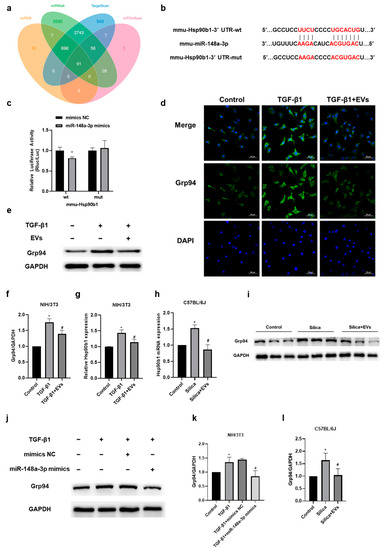 To clarify the potential molecular mechanism of miR-148a-3p, we used various prediction algorithms, including TargetScan, miRDB, miRTarBase, and miRWalk (Figure 5a), to identify Hsp90b1 as a potential target of miR-148a-3p. To verify the interaction between miR-148a-3p and Hsp90b1, we performed a dual-luciferase reporter gene assay. The wild-type (wt) 3′-UTR sequence and the mutant (mut) 3′-UTR sequence of Hsp90b1 were cloned to construct reporter plasmids, respectively (Figure 5b). The results displayed that the co-transfection of miR-148a-3p mimics and the wt-Hsp90b1 reporter gene plasmid decreased the luciferase activity significantly, whereas no effect was observed with the mutant plasmid (Figure 5c), confirming that Hsp90b1 was a target of miR-148a-3p. We subsequently sought to determine whether Hsp90b1 was correlated with the inhibition of pulmonary fibrosis by hucMSC-EVs. Our in vivo results showed that Grp94, encoded by Hsp90b1 [32], was upregulated in the TGF-β1-stimulated NIH/3T3 cells but downregulated after hucMSC-EV treatment (Figure 5d–f), and the change at the gene level of Hsp90b1 was consistent with the protein level (Figure 5g). We further examined the mRNA and protein levels of Hsp90b1 in vivo. Our results showed that the gene and protein level of Hsp90b1 in mice lung tissue was increased upon silica exposure, while hucMSC-EV intervention could mitigate this upregulation (Figure 5h,i,l). Additionally, we observed that the overexpression of miR-148a-3p suppressed the upregulation of Grp94 induced by TGF-β1 in NIH/3T3 cells (Figure 5j,k). These observations collectively confirmed that miR-148a-3p might play an important role in hucMSC-EVs’ amelioration of silica-induced pulmonary fibrosis via affecting the function of fibroblasts by targeting Hsp90b1.