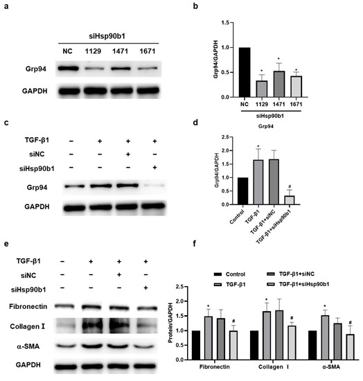 Inhibition of Hsp90b1 suppresses fibrosis-related proteins in NIH/3T3 cells. (a,b) Western blotting analysis of Grp94 in NIH/3T3 cells transfected with three small interfering RNAs (siRNAs) of Hsp90b1 (siHsp90b1-1129/1471/1671) and its negative Control (NC). * p < 0.05 compared with the siNC group. (c,d) Western blotting analysis of Grp94 in NIH/3T3 cells stimulated by TGF-β1 for 24 h after transfection with siHsp90b1-1129/NC for 12 h. (e,f) Western blotting analysis of Fibronectin, Collagen I, and α-SMA in NIH/3T3 cells stimulated by TGF-β1 for 24 h after transfection with siHsp90b1-1129/NC for 12 h.* p < 0.05 compared with the control group. # p < 0.05 compared with the TGF-β1 + siNC group. Data are shown as the means ± SD (n ≥ 3).
