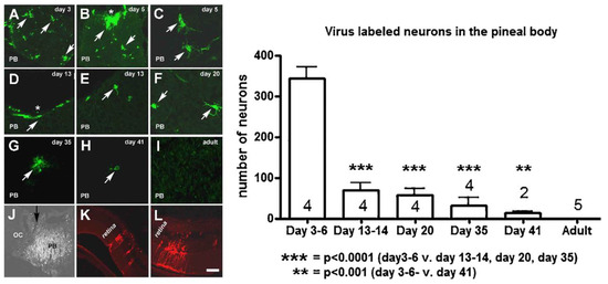 (A–I) Microphotographs show representative sections from the PB of rats of different ages after intravitreal administration of memGreen-RV. The white arrows indicate virus-labeled perikarya. The asterisk shows the rostral pole where the neuronal fibers enter the organ. (J) A black arrow shows the site of administration of Ka-VHSmCherry-A-RV into PB and (K,L) demonstrates the retinal labeling after this intervention. Abbreviations: OC = occipital cortex; PB = pineal body. Scale = 500 μm in J and 50 μm in A–I and K and L. The chart bar shows the quantitative assessment of the number of virus-labeled cells in the PB of rats with different ages. The number of cells tremendously decreased after 6 days following birth, with a continued gradual decrease until puberty. By puberty, they completely disappeared. In adult rats, neurons were not found in the PB. The numbers in or above the bars indicate the number of animals. Reprinted from Neuroscience Letters, 665, 189–194, Csáki et al. Ontogenesis of the pinealo-retinal neuronal connection in albino rats. 2018. with permission from Elsevier. ISSN: 0304-3940 [73].