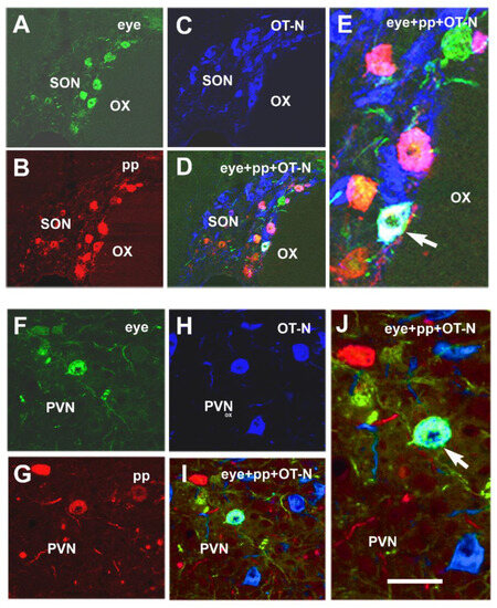 Microphotographs showing oxytocin (OT-N) immunoreactivity in double-virus-labeled neurons in the SON and PVN. (A) Ka-gEI-memGFP-RV green labeling in the SON of an intact rat. (B) Ka-gEI-memTomato-A-RV red labeling in the SON of the same section of an intact rat. (C) OT-N immunostaining in the SON of the same section (seen in blue). (D) Triple-labeled neuron in a confocal merge image of the SON (whitish color). (E) High-power detail of D. (F) Ka-gEI-memGFP-RV green labeling in the PVN of an intact rat. (G) Ka-gEI-memTomato-A-RV red labeling in the PVN of the same section. (H) OT immunostaining in the PVN of the same section (blue). (I) Triple-labeled neuron in a confocal merge image of the PVN (bluish white). (J) High-power detail of (D). Arrow shows triple-labeled cell in (E,J). Abbreviations OT-N = oxytocin neurophysin; OX = optic chiasm; PP = posterior pituitary; PVN = paraventricular nucleus; SON = supraoptic nucleus,. Scale: 160 µm in (A–D) and 40 µm in (E), 80 µm in (F–I) and 40 µm in (J). Reprinted from NeuroSci 2021, 2, 27–44. Csáki et al. The Same Magnocellular Neurons Send Axon Collaterals to the Posterior Pituitary and Retina or to the Posterior Pituitary and Autonomic Preganglionic Centers of the Eye in Rats. With permission from MDPI [77].