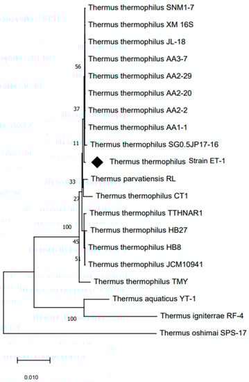 The analysis of the 16S rRNA gene sequence identified this microorganism as a bacterium belonging to the Thermus genus. The sequencing data revealed that the T. thermophilus strain ET-1 shares a high similarity of 99% with T. thermophilus SGO.5JP 17-16 (762633), shown in Figure 2.