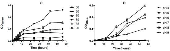To further characterize this strain, we analyzed the growing properties of this microorganism in liquid TM media. The optimal growth temperature was 80 °C, reaching the stationary phase after 40 h of incubation (Figure 3a). The optimal pH growth was observed in the range between 7 and 9 with an optimum growth at pH 8 (Figure 3b) at 80 °C.