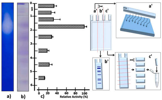 Native PAGE of the enzymatic extract from T. thermophilus strain ET-1. The native PAGE was processed as indicated on the left of the figure: Strips of the gel were excised to test for: (a) Caseinolytic activity zymogram, diagram of lane processing, and the post-revealed result of the halo of caseinolytic activity; this methodology is schematized in a′. (b) Native PAGE stained with Coomassie Blue; this methodology is schematized in b′. (c) Caseinolytic activity assays from sectioned native PAGE segments; relative caseinolytic activity is plotted on a horizontal bar graph. The results represent the average of triplicate samples ± SD. Error bars display standard deviations at each data point; this methodology is schematized in c′.
