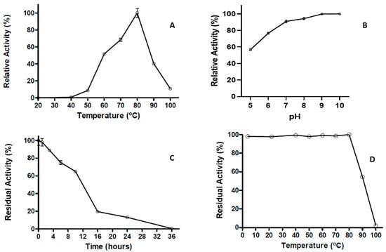 Optimal parameters of T. thermophilus strain ET-1 extracellular proteolytic activity. (A) Optimal temperature of proteolytic activity. (B) Optimal pH of proteolytic activity. (C) Thermoresistance of proteolytic activity to 80 °C (from 0 to 36 h). (D) Thermostability of proteolytic activity for one hour at different temperatures (from 4 to 100 °C). The results represent the average of triplicate samples ± SD. Error bars display standard deviations at each data point.