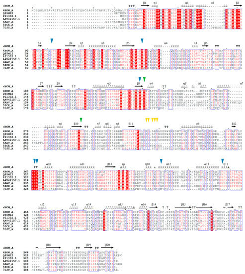 Multiple sequence alignment of the sucrose isomerase PalI NX-5 (Swiss-Prot: 4HOW_A) and other enzymes from the GH13 family. Amino acid sequences of the trehalose-6-phosphate hydrolase from Bacillus licheniformis (Swiss-Prot: Q65MI2), the oligo-1,6-glucosidase from Bacillus cereus ATCC7064 (Swiss-Prot: P21332.1), the 1,6-α-glucosidase from Lactobacillus acidophilus NCFM (Swiss-Prot: AAV42157.1), the α-glucosyl transfer enzyme XgtA from Xanthomonas campestris WU-9701 (Swiss-Prot: 6AAV_A), the α-glucosidase BspAG13_31A from Bacillus sp. AHU2216 (Swiss-Prot: 5ZCE_A), and the α-amylase from Ruminococcus bromii (Swiss-Prot: 7JJT_A) are displayed. The residues from PalI NX-5 involved in sucrose binding are indicated with a blue triangle, residues crucial for sucrose hydrolysis are highlighted with a green triangle, while residues involved in isomerization and specificity towards isomaltulose formation are denoted with an orange triangle. Sequence alignments were generated using the software MEGA 11 Version 11.0.13 [83] and ESPript [84]. Secondary structures are designated according to the crystal structure of PalI NX-5 and are presented on top: helices with squiggles, beta strands with arrows, turns with TTT letters. Residues depicted or highlighted in red within the blue blocks represent conserved residues.
