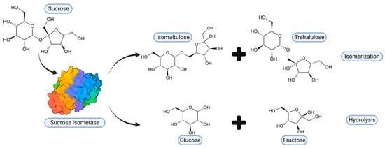 Among SIase, five highly conserved residues present in the catalytic N-terminal domain stand out. Zhang et al. [61] point to Asp241, Glu295, and Asp369 (position in the PalI isoform) as the potential catalytic triad, while His145 and His368 are highly conserved in α-amylases and glycosyltransferases [85]. In PalI SIase, Glu295 acts as a general acid by protonating the oxygen of the glycosidic bond and producing substrate hydrolysis; then, the Oδ2 of Asp241 acts as a nucleophile and attacks the C1 of D-glycosyl, forming the β-glycosyl-enzyme intermediate, while Asp369 forms hydrogen bonds with O2 and O3. His145 forms a hydrogen bond with O6 and His368 with O2. Isomaltulose is produced when the O6 of D-fructose (hydrolysis product) nucleophilically binds to the C1 of the D-glycosyl group [61]. Unlike the GH13 enzyme family, among SIase, the RLDRD motif (RYDRA, in the MutB isoform) is highly conserved. The sequence 325RLDRD329 (position in the PalI isoform) is adjacent to the active site cleft. Through directed mutagenesis analysis of this sequence, its indispensable and determinant role in enzymatic kinetics and specificity towards isomaltulose formation has been confirmed [61,86]. Based on modeling studies, it is suggested that the RLDRD sequence, especially the two arginines, is involved in binding to fructose [86]. In this way, SIase possesses both isomerase and hydrolase activities, although the amounts of D-glucose and D-fructose are minimal [43]. Thus, isomaltulose and trehalulose are the primary products of the enzyme’s catalytic action [29] (Figure 3).