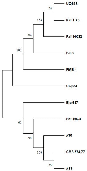 Phylogenetic tree of sucrose isomerase isoforms. A consensus phylogenetic tree was constructed using the the software MEGA 11 Version 11.0.13 [83]. The evolutionary history was inferred using the Maximum Likelihood method and the JTT matrix-based model. The tree with the highest log likelihood (−5484.74) is displayed. The percentage of trees in which the associated taxa clustered together is indicated next to the branches. Initial tree(s) for the heuristic search were automatically obtained by applying the Neighbor-Join and BioNJ algorithms to a matrix of pairwise distances, which were estimated using the JTT model. Then, the topology with the superior log likelihood value was selected. This analysis included 11 amino acid sequences. The final dataset comprised 600 positions. The sequences used belong to the isoforms: PalI NX-5 (GenBank: ADJ56407), CBS 574.77 (GenBank: 3GBE_A), PalI NK33 (GenBank: AAM96902.1), UQ68J (GenBank: AAP57083.1), UQ14S (GenBank: AAP57085.1), PalI LX3 (GenBank: 1M53_A), A30 (GenBank: EKF64560.1), AS9 (GenBank: ALS09706.1), Ejp617 (GenBank: ADP12651.1), FMB-1 (GenBank: ACF42098.1), and Pal-2 (GenBank: VUC84579.1).