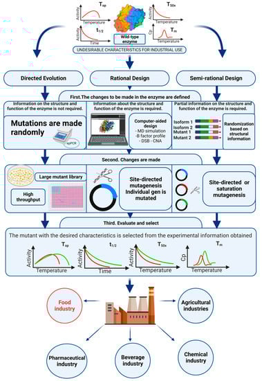 Rational design is rooted in understanding the relationship between a protein’s structure and function [138]. Based on this relationship, precise changes are introduced into the amino acid sequence through site-directed mutagenesis [133]. In this regard, rational design and understanding of the structure–function relationship have evolved synergistically, thus opening new perspectives for modulating enzymatic function and de novo prediction [139]. These attributes give rational design the potential to drastically reduce the size of the mutant library and the associated screening costs [92]. In recent years, with the development of bioinformatics, numerous algorithms and computational tools have emerged that allow the monitoring of flexible regions in protein molecules, as well as predicting thermostabilization [140,141]. Precisely, computer-assisted rational design is an attractive alternative that speeds up the process of enzymatic engineering [142]. Commonly, in the in silico stabilization of enzymes, strategies are followed such as comparison with homologous sequences of greater thermostability [143], analysis of the B-factor [144,145], molecular dynamics (MD) simulations [113,146], constraint network analysis (CNA) [147], designing disulfide bonds (DSB) [142,148,149], engineering glycosylation sites [150], designing stabilizing salt bridges based on enzyme sequence and structure [151], and calculations to minimize effective energy that mimics Gibbs free energy [152,153]. During the application of these strategies, substitutions made should not belong to a stabilization center or the active site cavity. Thus, mutations are often observed in loop regions or exposed surface areas [110,115].