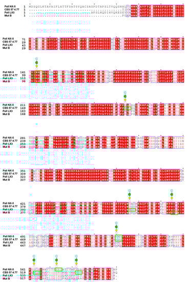 Indicated in green boxes are the potential sites for N-glycosylation present in the PalI NX-5, CBS 574.77, PalI LX3, and MutB isoforms. Monosaccharides point to the glycosylable asparagine residue, monosaccharide symbols follow the SNFG system. Residues depicted or highlighted in red within the blue blocks represent conserved residues. Sequence alignments were generated using the software MEGA 11 Version 11.0.13 [83] and ESPript [84].