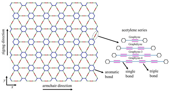 The introduction of monolayer graphene in 2004 was a scientific breakthrough in the field of materials due to its combination of superior mechanical, electromagnetic, optical, and thermal properties [1,2]. In recent years, efforts have been made to discover materials and structures at the nanoscale that are akin to graphene or possess superior physical and structural attributes compared to graphene. Among the most promising recently identified graphene-like nanomaterials is the family of graphyne materials, initially examined theoretically by Balaban and colleagues [3], and subsequently by Narita and Nagai through first-principles analysis [4]. Graphyne represents a novel category of two-dimensional (2D) substances that have recently garnered interest owing to their distinct physical and chemical characteristics. Comprising sp- and sp2-bonded carbon atoms, these substances exhibit a honeycomb configuration akin to graphene, but with extra atoms or functional groups affixed to the carbon atoms. The presence of these additional atoms or groups gives rise to a wide range of properties, including enhanced electrical conductivity, mechanical strength, and chemical stability [5,6,7].