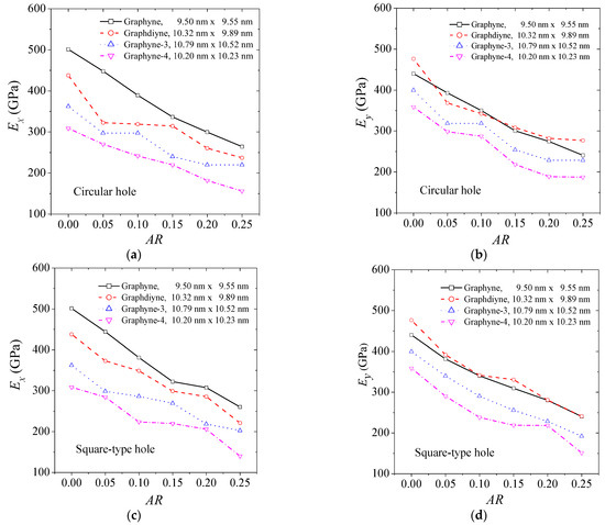 The behavior of the elastic modulus of graphyne structures (graphyne, graphdiyne, graphyne-3, graphyne-4) with increasing aspect ratio of the hole is an important aspect of understanding the mechanical properties of these materials. Figure 3 provides insights on this behavior, illustrating the change in elastic modulus for different types of holes. Figure 3a,b show the behavior of the elastic modulus in the x and y axis for the case of a central circular hole for the four structures. Figure 3b,c depict the case of a square hole, while Figure 3c,d describe the case of a rhombus-type hole. The elastic modulus is seen to decrease as the size of the hole increases in all circumstances. Additionally, the rate of decrease in the elastic modulus with an increase in hole size is similar for all cases. This suggests that the graphyne structures have a relatively consistent response to the introduction of holes in their structure. However, small fluctuations in the elastic modulus may be attributed to the non-symmetric geometric effects caused by the hole creation, depending on the number of atoms and bonds cut off. As the length of the acetylene series increases, the elastic modulus is generally lower in all cases. This highlights the importance of the number of atoms and bonds in determining the mechanical properties of graphyne structures. Close values are observed concerning the elastic modulus in the y-direction between the graphyne and graphdiyne specifically, indicating that these two structures may have similar mechanical properties in certain directions.