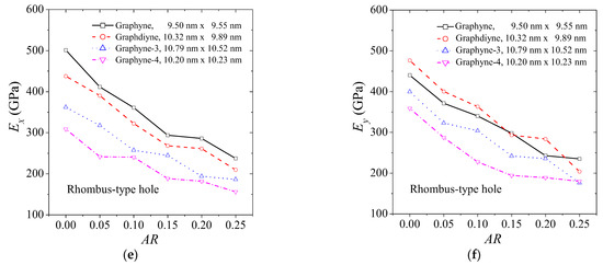 The elastic modulus of graphyne structures vs. aspect ratio in (a) x—direction for the circular hole, (b) y—direction for the circular hole, (c) x—direction for the square hole, (d) y—direction for the square hole, (e) x—direction for the rhombus-type hole, and (f) y—direction for the rhombus-type hole.