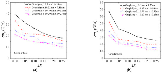 The mechanical tensile strength of graphyne structures (graphyne, graphdiyne, graphyne-3, graphyne-4) seems to be considerably affected by the aspect ratio of the hole. Figure 4 illustrates the change in ultimate strength for different types of holes. Figure 4a,b show the ultimate strength in the x and y axis for the case of a central circular hole for the four structures. Figure 4b,c depict the case of a square hole, while Figure 4c,d describe the case of a rhombus-type hole. As the size of the hole increases, the structure can experience a significant reduction in strength, with losses of up to almost 50% observed for aspect ratios near 0.25. The rate of decrease in the ultimate strength with an increase in hole size is similar for all cases. Small fluctuations in the ultimate strength may be observed for the same reasons as previously.