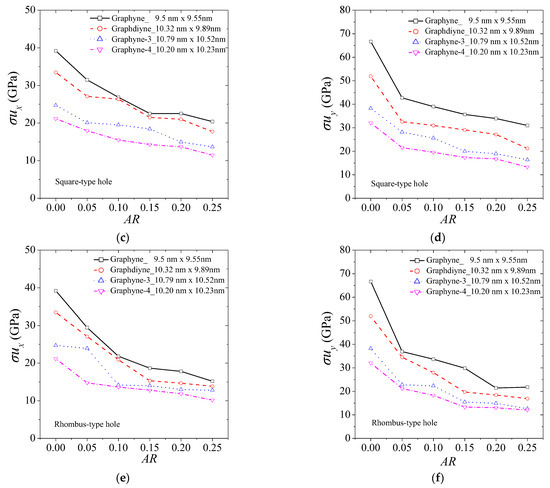 The ultimate tensile strength of graphyne structures vs. aspect ratio in (a) x—direction for the circular hole, (b) y—direction for the circular hole, (c) x—direction for the square hole, (d) y—direction for the square hole, (e) x—direction for the rhombus-type hole, and (f) y—direction for the rhombus-type hole.