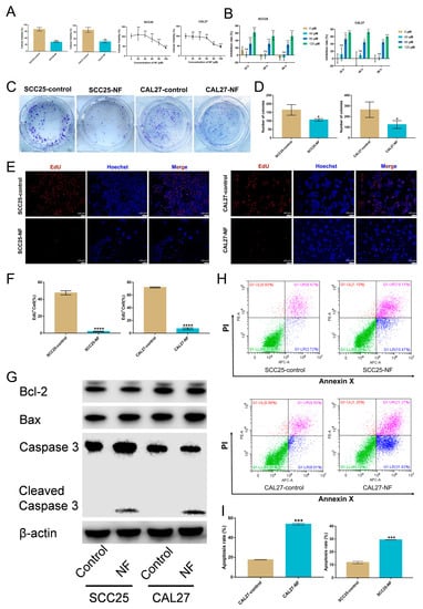 Nuciferine (NF) inhibited the proliferation and promoted the apoptosis of OSCC cells. (A) The growth-inhibiting effects of NF (100 μM, 24 h) and the cytotoxicity test of NF (0~100 μM, 24 h) on OSCC cells were detected by CCK–8. (B) The viability of SCC25 and CAL27 cells was inhibited by NF (0~120 μM, 0~96 h) in a dose-dependent manner, as verified by CCK–8. (C–F) The proliferation of OSCC cells was suppressed by NF, as demonstrated by the colony formation assay (80 μM, 7 d) and EdU assay (80 μM, 24 h). (G) Increased expression of pro-apoptosis markers Bax and Caspase 3, and decreased expression of anti-apoptosis marker Bcl-2 in OSCC cells treated with NF (80 μM, 48 h) were detected by western blot. (H,I) The apoptosis-promoting effects of NF (80 μM, 48 h) on OSCC cells were verified by flow cytometry. ns, not significant. * p < 0.05, ** p < 0.01, *** p < 0.001 and *** p < 0.0001.