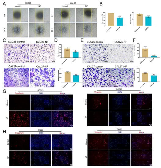 NF inhibited the migration and invasion of OSCC cells. (A,B) The migration of OSCC cells was inhibited by NF at a non-lethal concentration (30 μM, 24 h or 36 h), as confirmed by the wound healing assay. (C,D) Migration of OSCC cells was suppressed by NF at a non-lethal concentration (30 μM, 24 h), as demonstrated by a transwell assay. (E,F) The invasion-inhibiting effects of NF of a non-lethal concentration (30 μM, 24 h) on OSCC cells were tested by a transwell system. (G,H) Increased expression of E-cadherin and decreased expression of Vimentin in OSCC cells after NF treatment (80 μM, 48 h) were detected by immunofluorescence. * p < 0.05, ** p < 0.01 and *** p < 0.001.