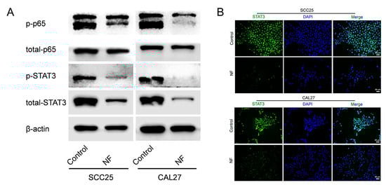 STAT3 signaling pathway was suppressed in NF-treated OSCC cells. (A) p65 and STAT3 signaling pathways were suppressed in OSCC cells treated with NF (80 μM, 48 h). (B) Suppressed STAT3 signaling pathway in NF-treated OSCC cells (80 μM, 48 h) was confirmed by immunofluorescence.