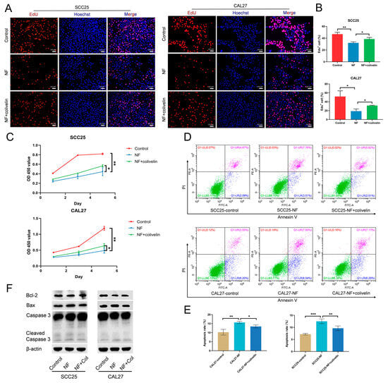 NF inhibited the proliferation and promoted the apoptosis of OSCC cells via suppressing the STAT3 signaling pathway. (A,B) NF-suppressed (80 μM) OSCC cell proliferation was promoted by colivelin (10 μM), as demonstrated by EdU assay (24 h). (C) NF-suppressed (80 μM) OSCC cell proliferation was promoted by colivelin (10 μM), as demonstrated by CCK-8 test (1, 3, 5 d). (D,E) The apoptosis-promoting effects of NF (80 μM) were weakened by colivelin (10 μM), as demonstrated by flow cytometry (48 h). (F) Increased expression of pro-apoptosis markers Bax and Caspase 3, and decreased expression of anti-apoptosis marker Bcl-2 in NF-treated (80 μM) OSCC cells was reversed, as detected by western blot (48 h). Col, colivelin. Scale bar, 100 μm. * p < 0.05, ** p < 0.01 and *** p < 0.001.