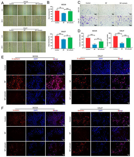 NF inhibited the migration and invasion of OSCC cells via suppressing the STAT3 signaling pathway. (A,B) NF-suppressed (30 μM) OSCC cell migration was promoted by colivelin (10 μM), as confirmed by the wound healing assay (24 h). (C,D) The invasion-inhibiting effect of NF (30 μM) on OSCC cells was weakened by colivelin (10 μM), as tested by a transwell system. (E,F) Increased expression of E-cadherin and decreased expression of Vimentin in NF-treated (80 μM) OSCC cells were reserved by colivelin (10 μM), as detected by immunofluorescence (48 h). ** p < 0.01, *** p < 0.001.