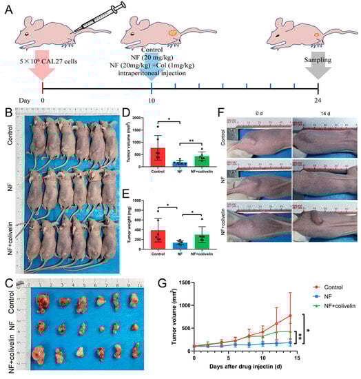 NF inhibited OSCC growth via suppressing the STAT3 signaling pathway. (A) The experimental procedure of CDX model. (B,D) Gross observation and tumor volume measurement of the mice in 3 groups after 2 weeks of drug injection. (C,E) Gross observation and tumor weight measurement of the isolated tumors in 3 groups after 2 weeks of drug injection. (F,G) Dynamic recording of tumor volume in mice in 3 groups during the process. * p < 0.05, ** p < 0.01.