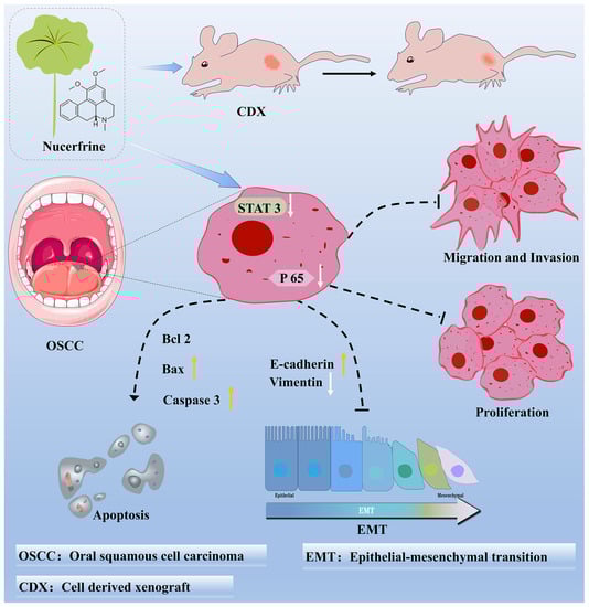 Originally demonstrated to have a weight loss effect in traditional Chinese medicine, nuciferine is a significant alkaloid found in the leaves of Nelumbo nucifera [12]. Besides this, many studies showed that nuciferine exhibited suppressive effects on different kinds of cancer [11,21]. Hence, to ascertain the role of nuciferine in inhibiting OSCC, numerous experiments were performed to examine how nuciferine affects the viability, growth, programmed cell death, movement, and infiltration of SCC25 and CAL27 cells; the diagram below demonstrates the concept (Figure 7). According to the findings, nuciferine demonstrated the ability to suppress the malignant characteristics of OSCC cells. In the CDX model, the effectiveness of nuciferine in inhibiting OSCC growth was verified. Mechanismly, the suppressed STAT3 signaling pathway mediated nuciferine-inhibited OSCC cell functions and tumor growth. In summary, our research revealed that nuciferine has the ability to inhibit the growth of OSCC by impeding the harmful actions of OSCC cells, partly by suppressing the STAT3 signaling pathway.