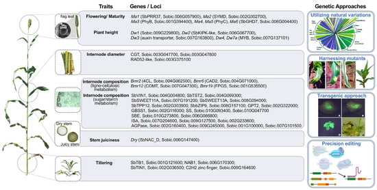 A diagram to summarize the biomass-related traits in sorghum, the current knowledge regarding the genetic control of these traits and possible genetic approaches to enhance the biomass traits. The traits are categorized into several groups: plant height, flowering/maturity, internode morphology (i.e., internode number, internode length, internode diameter), internode composition (including both lignocellulosic metabolism and sugar/starch metabolism), stem juiciness, and tillering. These genes have been previously reported to regulate or be associated with these traits. Sorghum varieties with excellent bioenergy performance could be accurately designed by pyramiding the superior alleles of important genes and genetic loci.