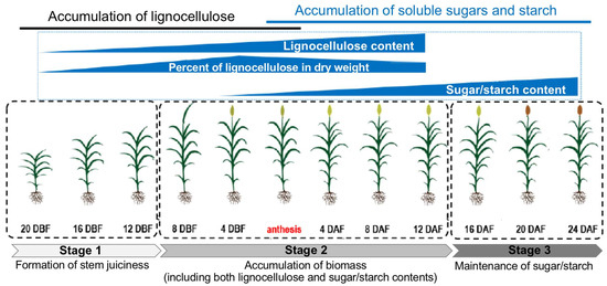 The dynamic process of stem elongation, biomass accumulation and changes in internode composition in sweet sorghum. The stem elongation and biomass accumulation process could be separated into three stages: Stage 1, around the end of stem elongation, programmed cell death is not initiated in sweet sorghum to keep internode parenchyma cells alive, forming the juicy stem, which is the basis of soluble sugar and/or starch accumulation in the stem; Stage 2, After stem elongation and before anthesis, soluble sugars are rapidly increased in the stems of sweet sorghum cultivars, reaching up to ~23% of the extracted stem juice; Stage 3, During the late stages of grain development, the starch content in the internode rises up, reaching up to ~10% of the stem dry weight. DAF, days after flowering; DBF, days before flowering. Anthesis stage is highlighted in red.