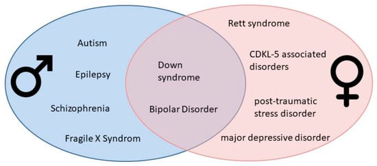 Down syndrome (DS) is the most common genetic cause of intellectual disability, with a prevalence of 1 in every 700 births. Down syndrome (DS) is caused by partial or full triplication of human chromosome 21 (Hsa21) [65]. Data taken from the literature indicate a prevalence of males in children with all trisomy 21 variants with a sex ratio of 1.24. The most prominent feature of DS is the learning and memory deficiency that affects 100% of patients. The disease also demonstrates other behavioral phenotypes, such as the incomplete and delayed acquisition of motor, linguistic, and visual–spatial abilities and neurobehavioral disorders. It was detected that DS males, as compared to females, have major behavioral problems, including attention deficit, hyperactivity-like behaviors in childhood, and depression in adulthood [12]. Other occurring phenotypes diagnosed in DS patients are related to cardiovascular disturbances, breathing, and skeletal alterations. It was noted that males were affected twice as much as females, suffering a higher prevalence of breathing disorders during sleep [13]. In contrast, a lower bone mineral density was detected in DS females [66].