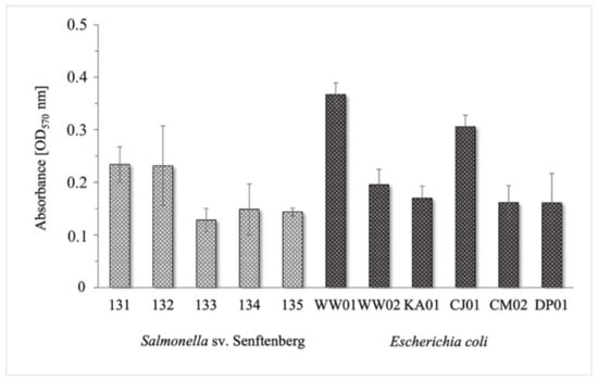 The biofilm formation capacity of the tested bacterial strains was determined in polystyrene microtiter plates. The intensity of biofilm formation was assessed based on spectrophotometric absorbance (OD) readings. It was shown that there were differences in the intensity of biofilm formation among the tested strains (Figure 1). The OD values for the S. Senftenberg strains ranged from 0.129 to 0.234 (±0.007–0.076). E. coli strains are better producers of biofilm (especially WW01, CJ01) as evidenced by their higher OD values of 0.161–0.367 (±0.022–0.056).