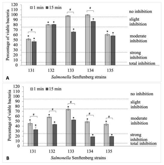 The viability of S. Senftenberg strains in biofilms after the application of formaldehyde at the concentrations of 0.02% (A) and 0.2% (B) for 1 and 15 min. Statistically significant results (p ≤ 0.05) of the tested samples compared with the control samples are marked with an asterisk (*); statistically significant differences (p ≤ 0.05) between samples treated with formaldehyde for 1 min and 15 min were noted with a hashtag (#). The experiment was repeated three times.