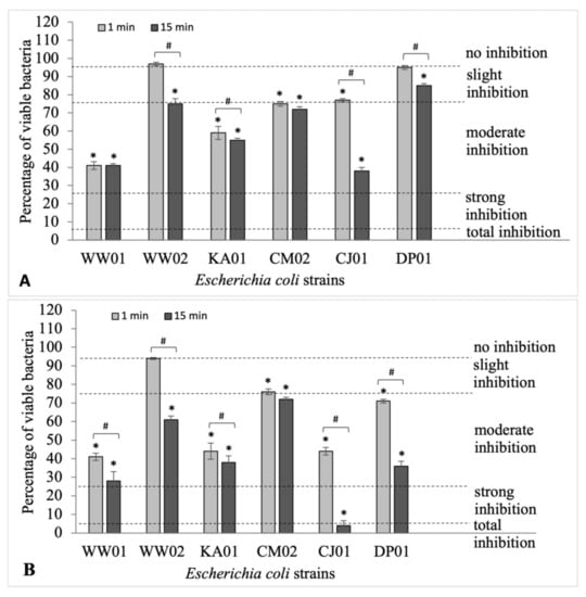 An in-depth analysis of the results presented in Figure 3A and Table S2 shows that formaldehyde used in the lowest concentration (0.02%) for 1 min significantly reduced the number of viable cells to 41% survival (WW01), 59% survival (KA01), 75% survival (CM02), and 77% survival (CJ01). Extending the duration of the disinfectant action to 15 min resulted in a significant reduction in the number of living cells of six E. coli strains. The results on to the action of 0.2% formaldehyde presented in Figure 3B show that a 1 min exposure of E. coli strains to 0.2% formaldehyde resulted in average growth inhibition (p ≤ 0.05), except for the E. coli WW02 strain, for which no inhibition of survival was observed. Extending the exposure time of 0.2% formaldehyde to 15 min significantly reduced the number of bacteria of all E. coli strains except CM02, whose survival was almost the same as after 1 min of exposure. Interestingly, after the 15 min treatment with the disinfectant, the growth of E. coli CJ01 was almost completely inhibited (4% survival).