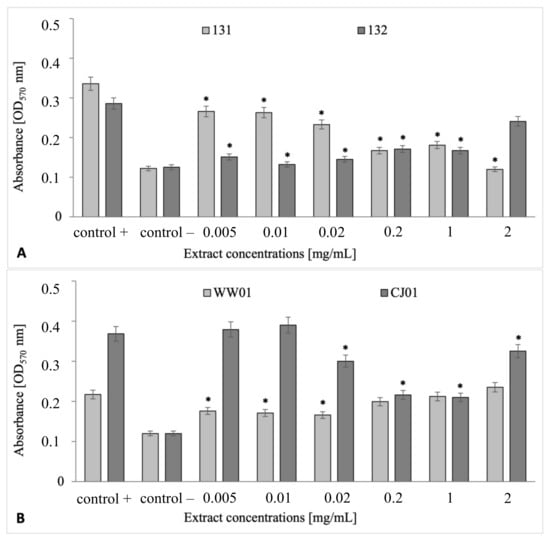 Antibiofilm properties of V. vitis-idaea extract in biofilms formed by S. Senftenberg 131 and 132 (A) and E. coli WW01 and CJ01 (B) strains. Statistically significant results (p ≤ 0.05) of the tested samples compared with the control samples are marked with an asterisk (*).