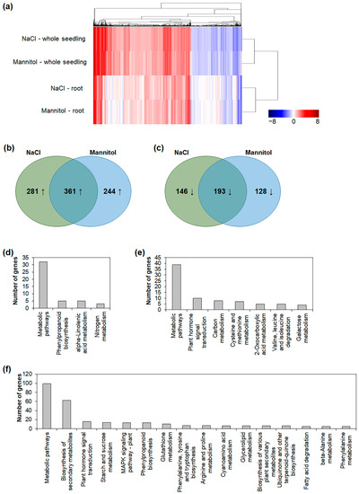 Hierarchical clustering, Venn diagrams and KEGG mapper of DEGs in roots and whole seedlings. (a) Hierarchical clustering of upregulated and downregulated genes was performed using MultiExperiment Viewer (MeV). Euclidean distance and average linage clustering were used for hierarchical clustering. (b) Venn diagram of upregulated genes in roots under NaCl and mannitol treatments. (c) Venn diagram of downregulated genes in roots under NaCl and mannitol treatments. (d) KEGG pathway of upregulated genes in roots under both NaCl and mannitol treatments. (e) KEGG pathway of upregulated genes in roots under NaCl treatment. (f) KEGG pathway of upregulated genes in roots under mannitol treatment. In (d–f), enriched KEGG pathway shown with p < 0.05.