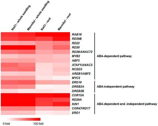 We analyzed the expressions of well-known ABA-dependent and/or ABA-independent osmotic stress-responsive genes in the roots using mRNA-Seq [10,29,30,31,32,33,34,35,36]. Among the 11 ABA-dependent-pathway-stress-responsive genes, the expression of RAB18 was markedly increased in the roots compared to that in the whole seedlings. In contrast, the expressions of the 10 remaining genes were only marginally increased in the roots (Figure 2 and Table S3). Furthermore, the expressions of three ABA-independent osmotic-stress-responsive genes and five ABA-dependent and -independent genes increased less in the roots than in the whole seedlings (Figure 2 and Table S3), indicating that these well-known osmotic-stress-responsive genes are not key players in osmotic stress responses in roots. Similarly, the expression analysis of the well-known ABA-dependent and/or ABA-independent osmotic-stress-responsive genes in different plant tissues using Genevestigator, a gene-expression resource, showed that their expressions in the root tissues were similar to or lower than those in the shoot tissues (Figure S5).